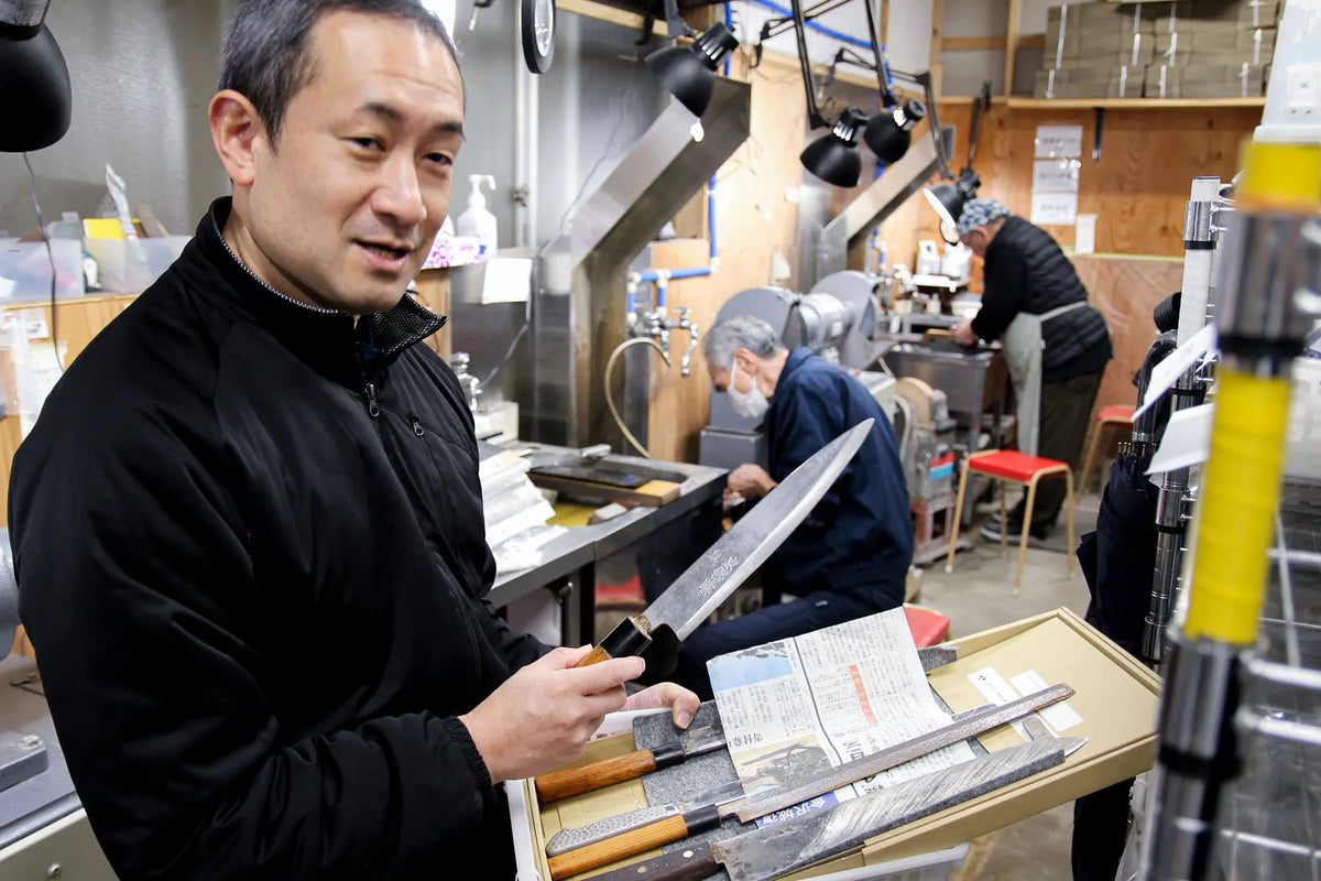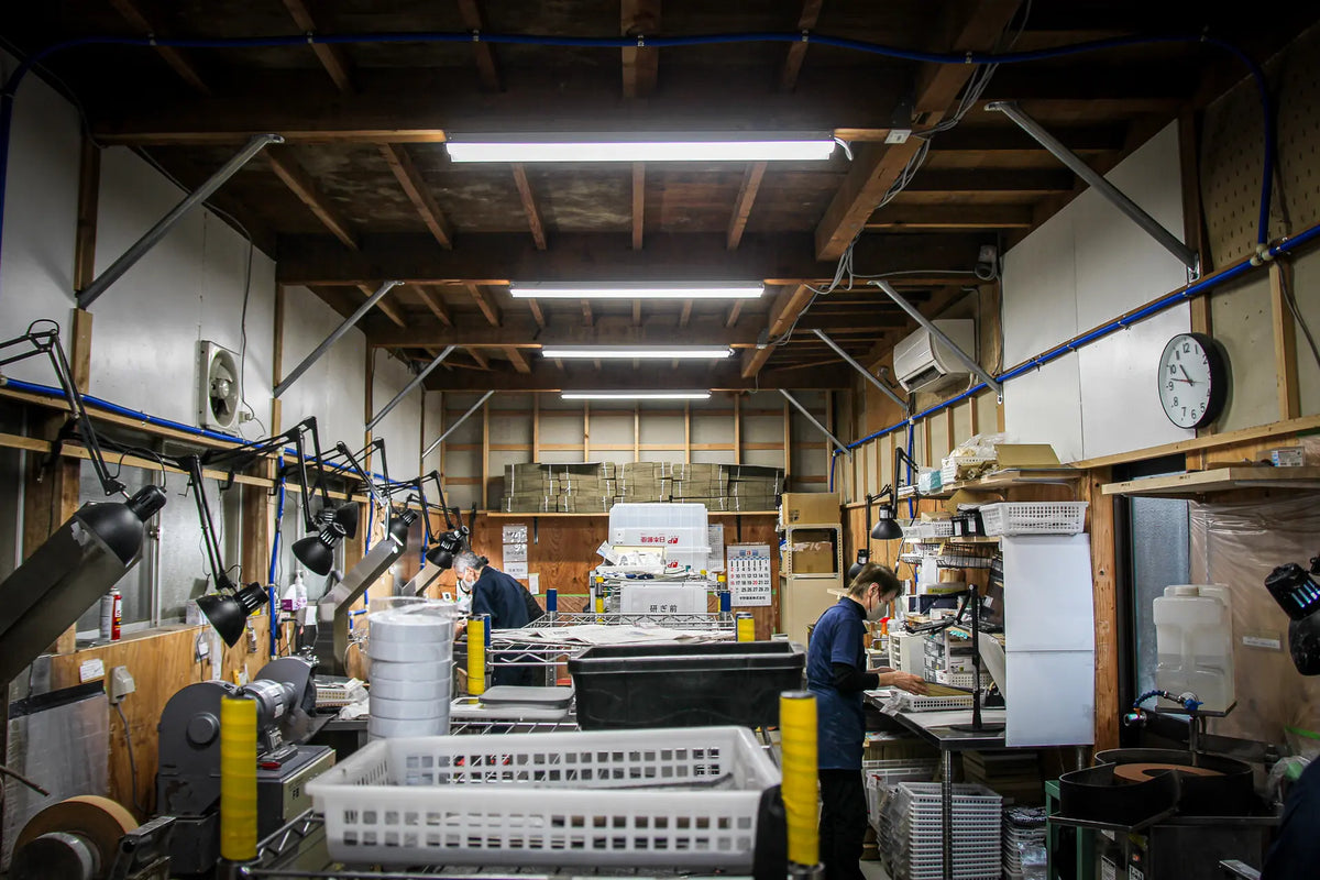 熟練から若手までが活躍する現場。包丁1本ごとの状態に合わせた研ぎが信頼を生む。