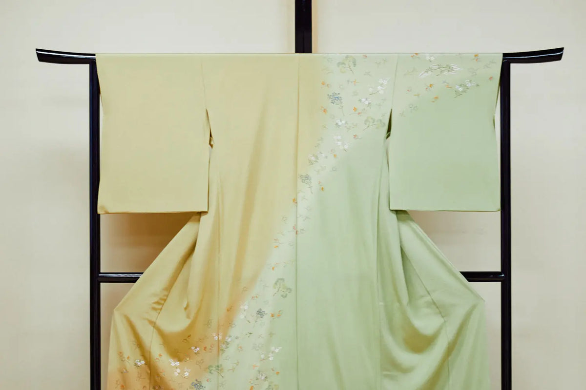 そのぼかし染めを生かすため、控えめに施された美しい刺繍。先代・福田喜重さんは刺繍の部門では唯一、重要無形文化財・人間国宝に認定されていました。ぼかし染と刺繍、これらを引き立てる空間のバランスをとった絵画的な構図は今も受け継がれ、高く評価されています。