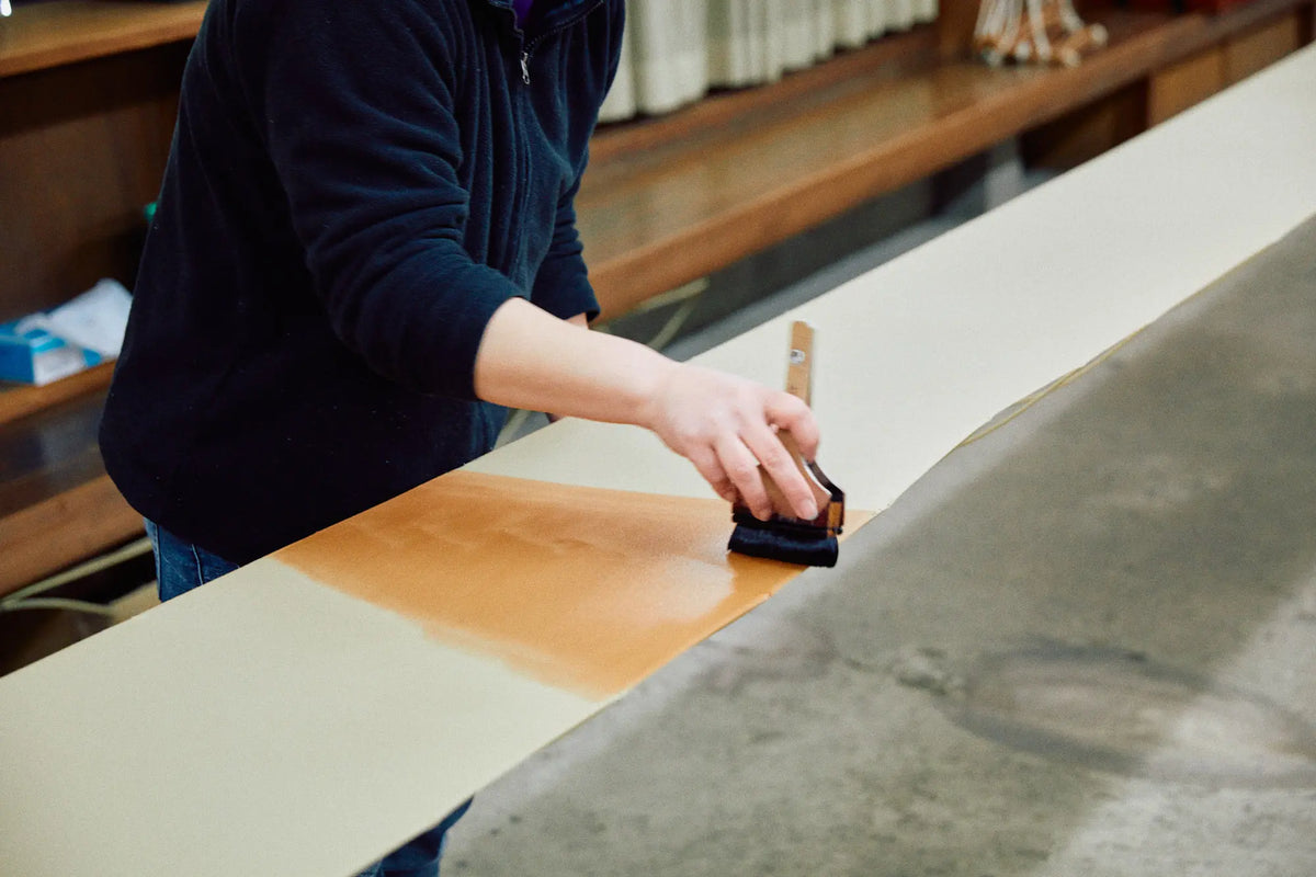 使用する染料は、独自で調合してオリジナルの色を製作。絵画的なデザインを実現するため、色を豊富に使うことを意識しています。一方で、この豊富な色をしっかりと生かす染色の工程は熟練の職人でないと難しく、綺麗に染めができるようになるまで約3年はかかるといわれています。というのも染色は、その日によって変化する湿度の影響などを受けるため、全く同じように染めることが難しく、色合いが変化したり、色の性格に合わせて染め方を変える必要があり(暖色は伸びやすく、寒色は伸びにくいなど)、知識と経験が必要となるからです。また福田喜では、反物をつなぎ合わせる際に色がズレないように、ぼかし足まできっちりと合わせるなど、一般的には難しい細部にまでコストをかけてこだわっています。