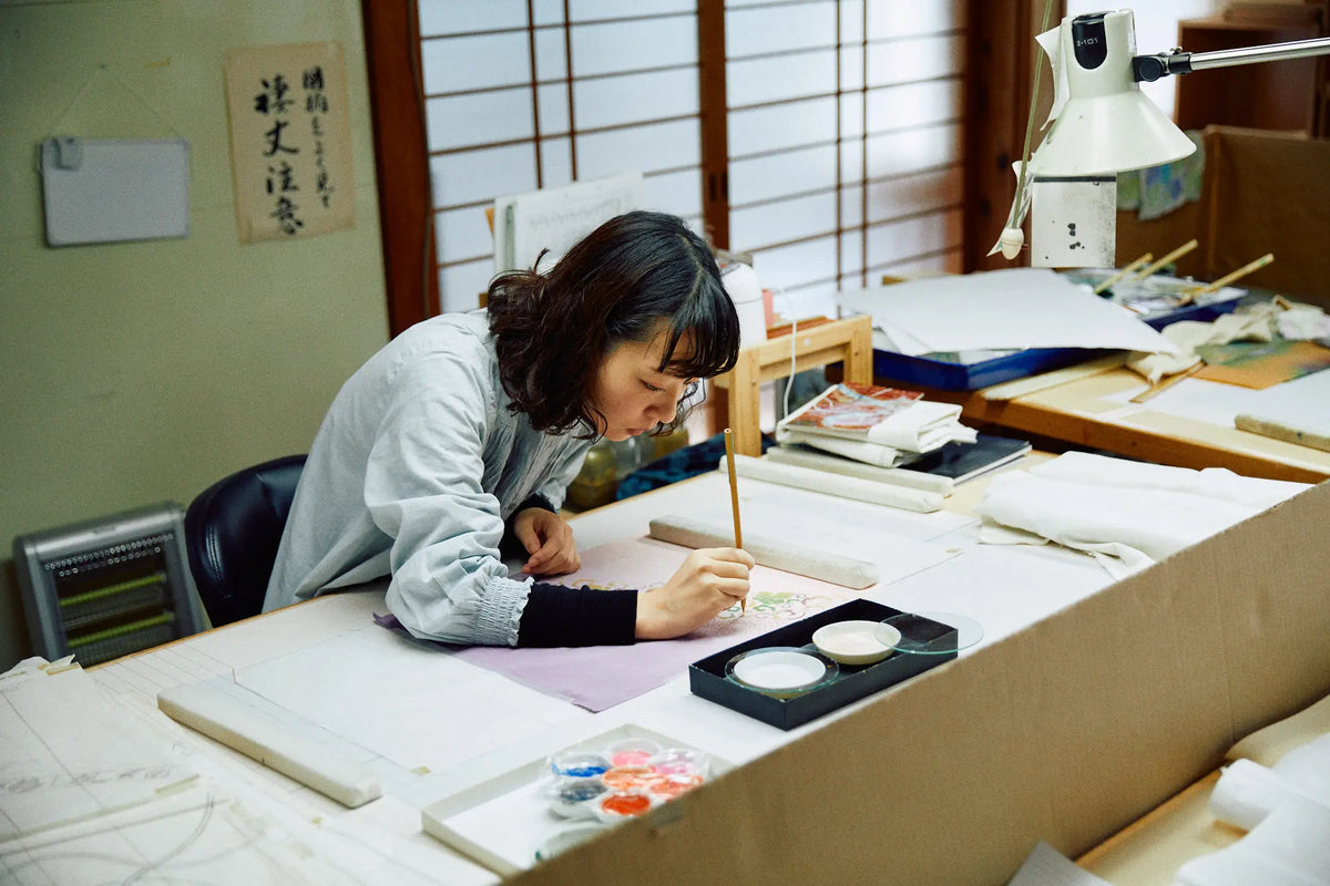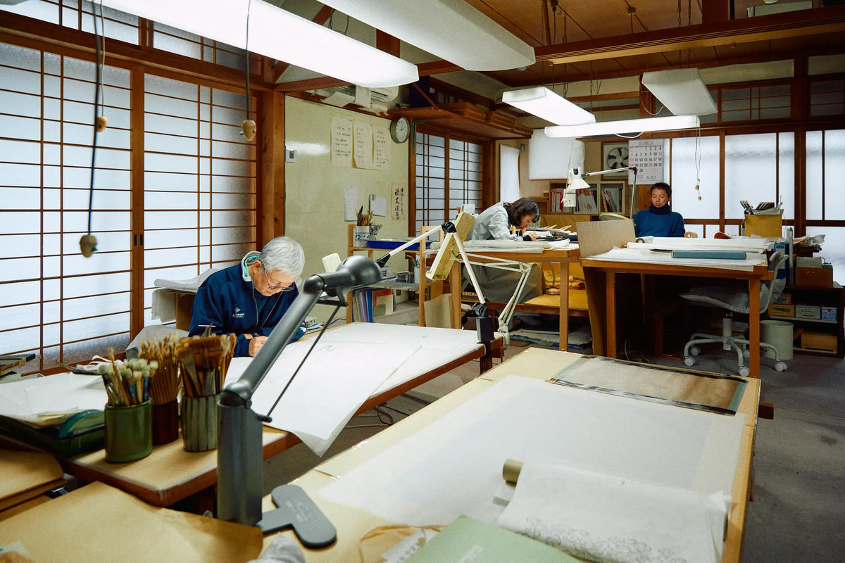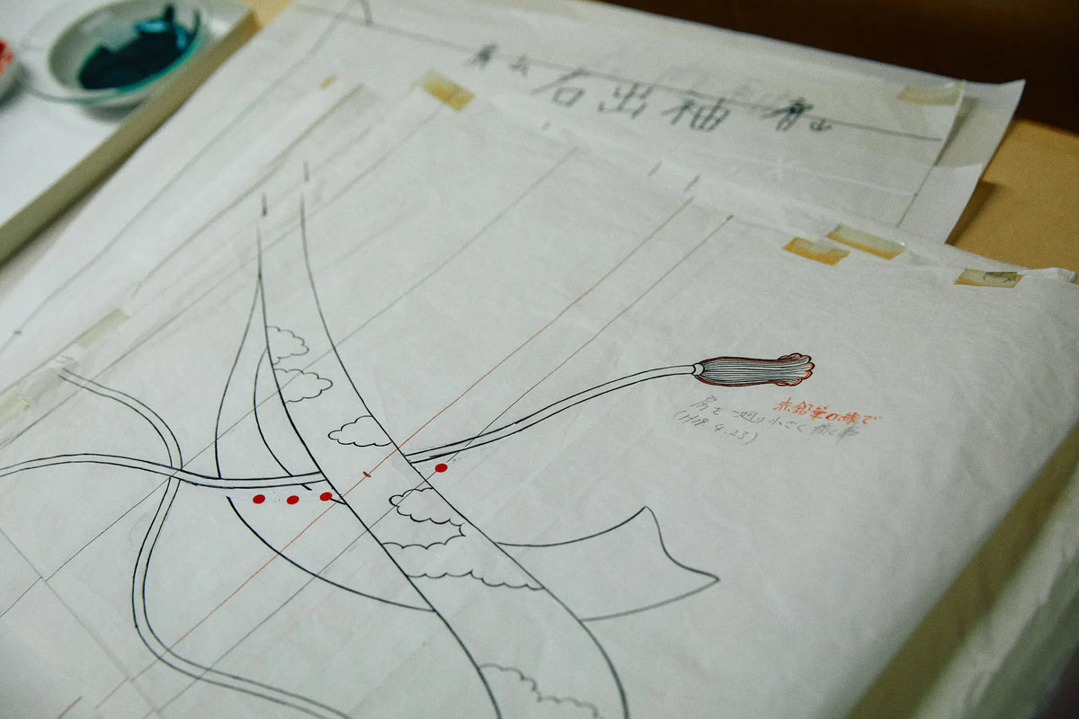 繊細な絵柄は「草稿」という木炭や鉛筆で描かれた、デザインの原案のようなものを元にひとつひとつ丁寧に描かれていく。