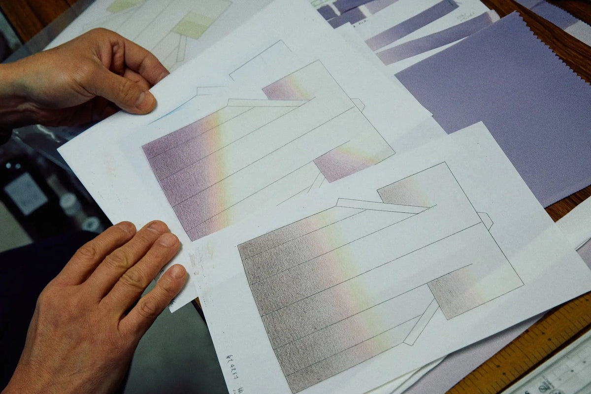 鮮やかなグラデーションが特徴の「ぼかし染め」は、日本の情景を表現した伝統的な技法です。この「ぼかし」は、靄がかった景色を眺めているような、湿度の高い日本ならではの気候風土を表現しています。(日本に比べてカラッと乾燥した気候のヨーロッパでは、はっきりとした色分けやビビッドな色がが多く使われています)