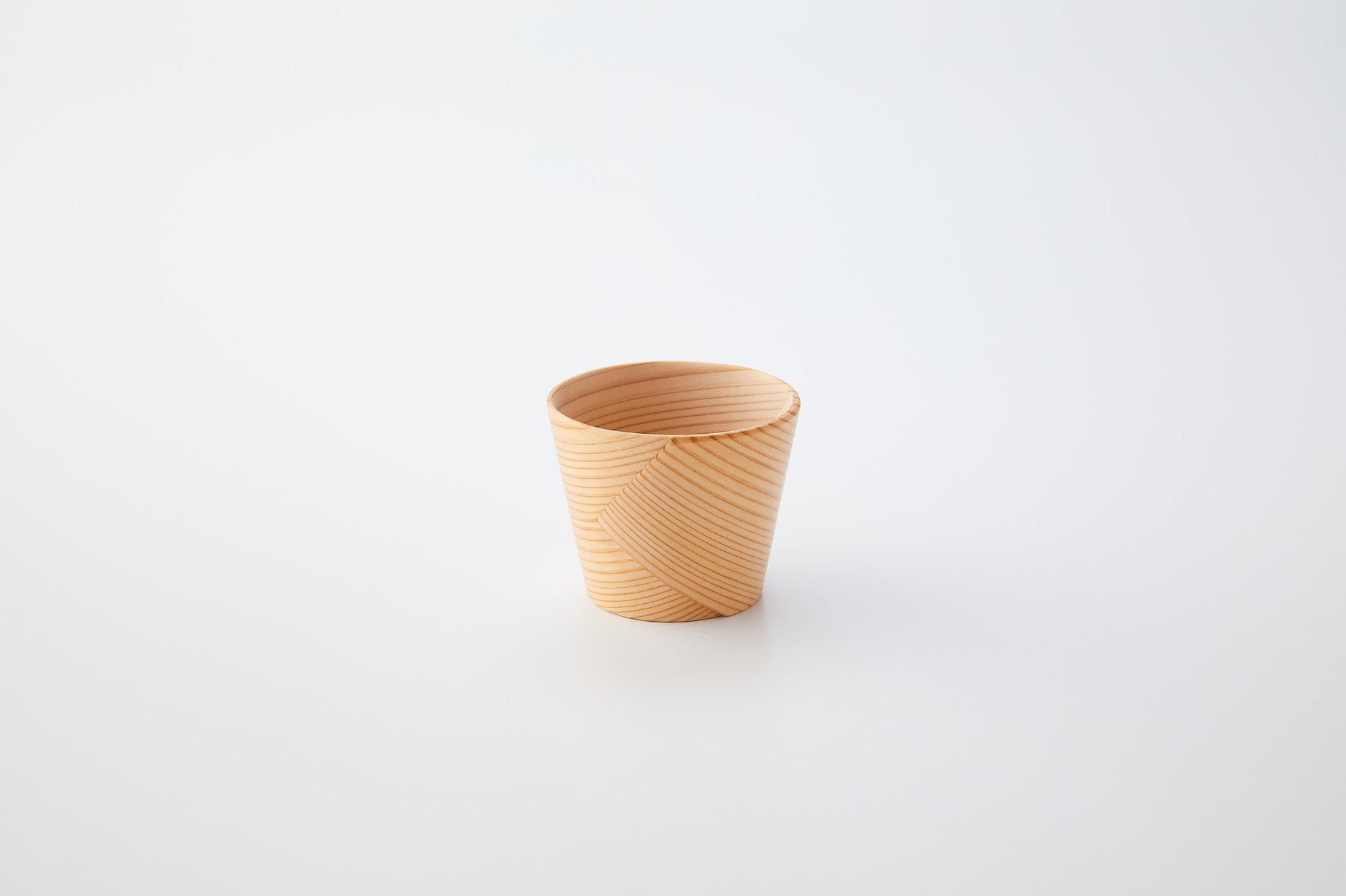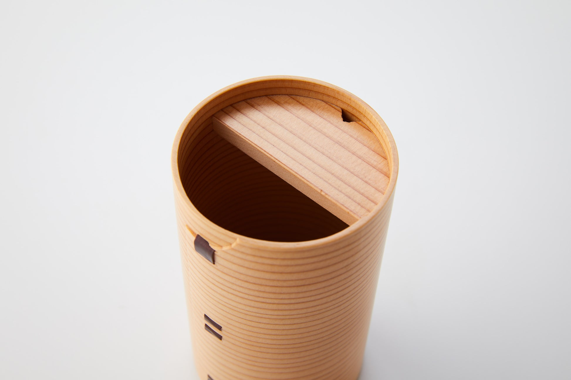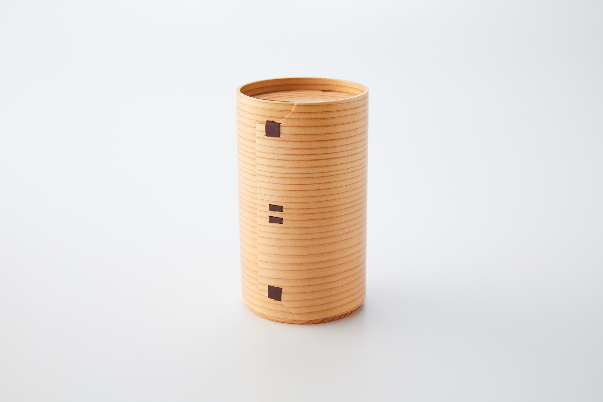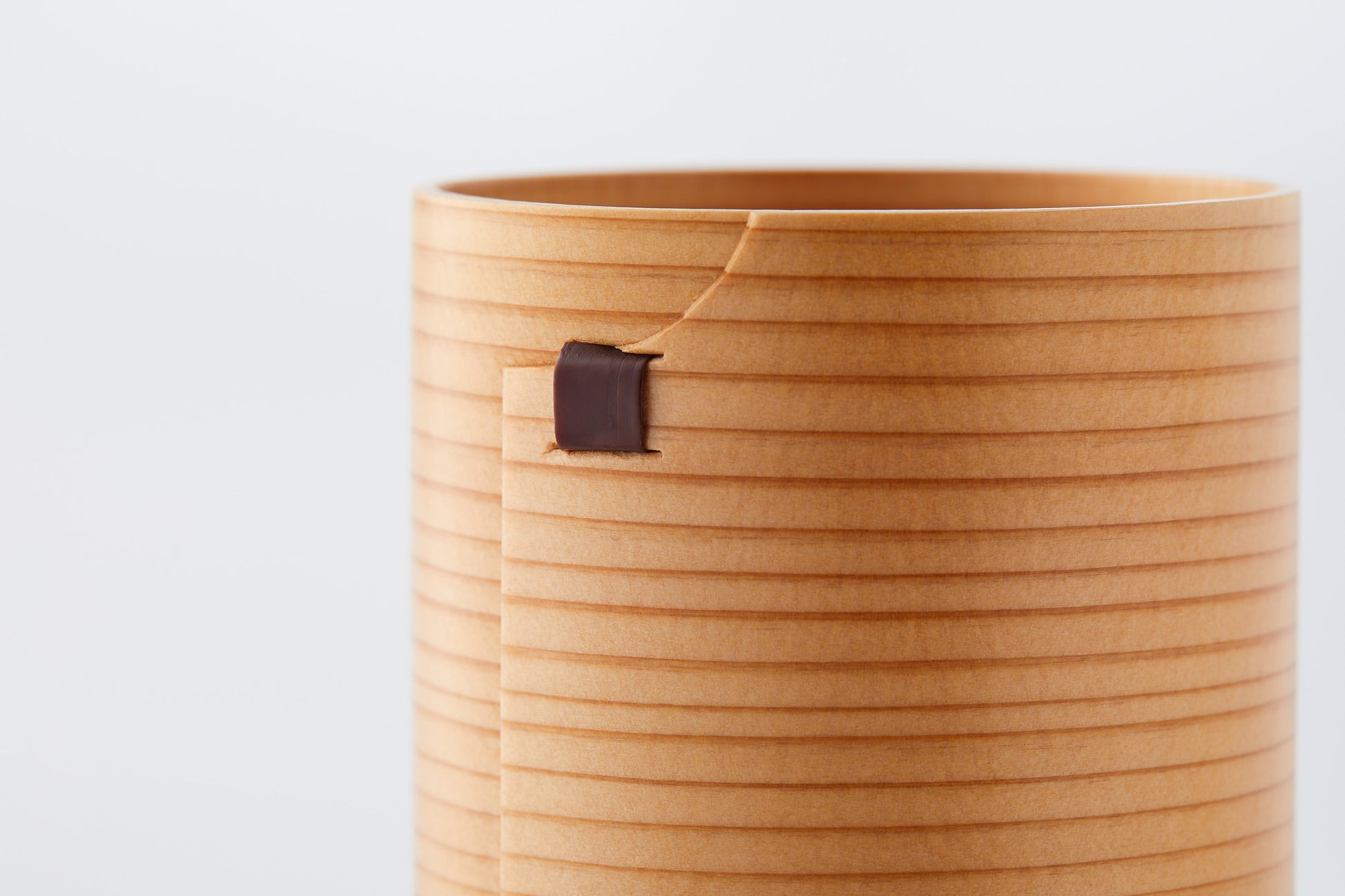秋田杉を薄く削いだ板を熱湯で煮て、柔らかくしてから筒状に丸め、合わせ目を接着。山桜の皮で縫うようにして固定し底板を密着させて作られています。秋田杉特有の真っ直ぐとした柾目の美しさに山桜の表情がデザインの一部としても可愛らしさを添えています。 2012年度グッドデザイン ・ロングライフデザイン賞受賞。