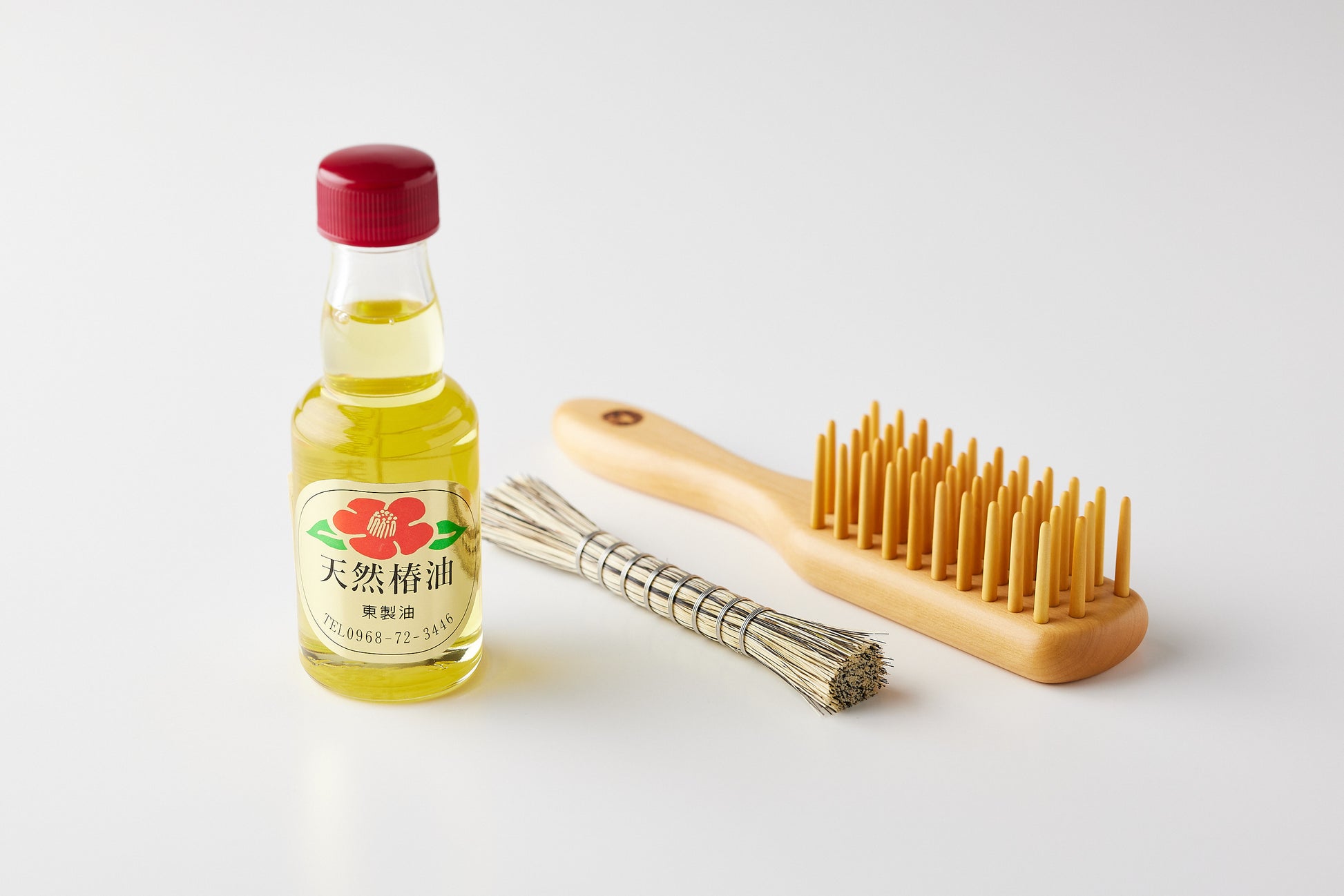 This product is a set that includes a tsuge brush, a dedicated care brush (approx. 11 cm long), and 70 ml of camellia oil.