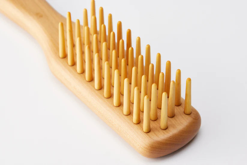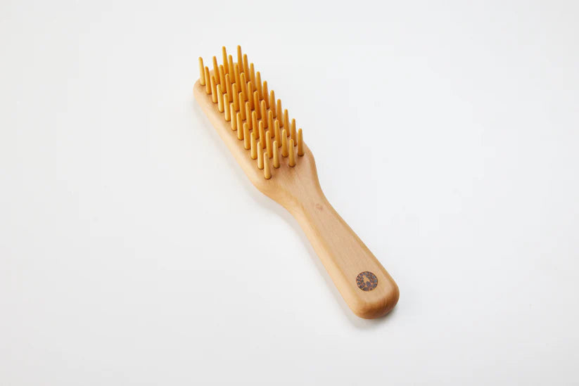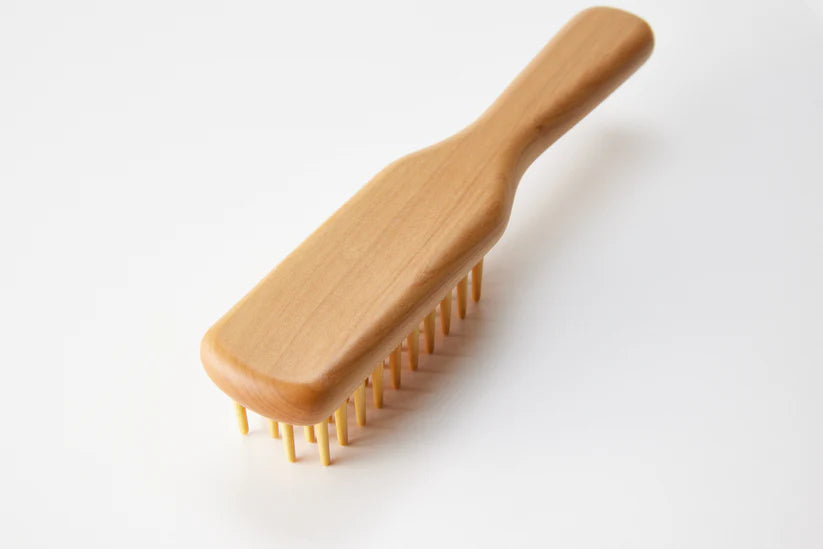 - Handmade using natural wood. Grain, color, and size may vary slightly. Please be aware of this in advance. - If stored in a sealed container due to temperature and humidity, discoloration and mold may occur. Please open the package as soon as possible after arrival. - Please be careful not to place the tsuge brush on the floor with the teeth (pins) facing up as this may cause injury.