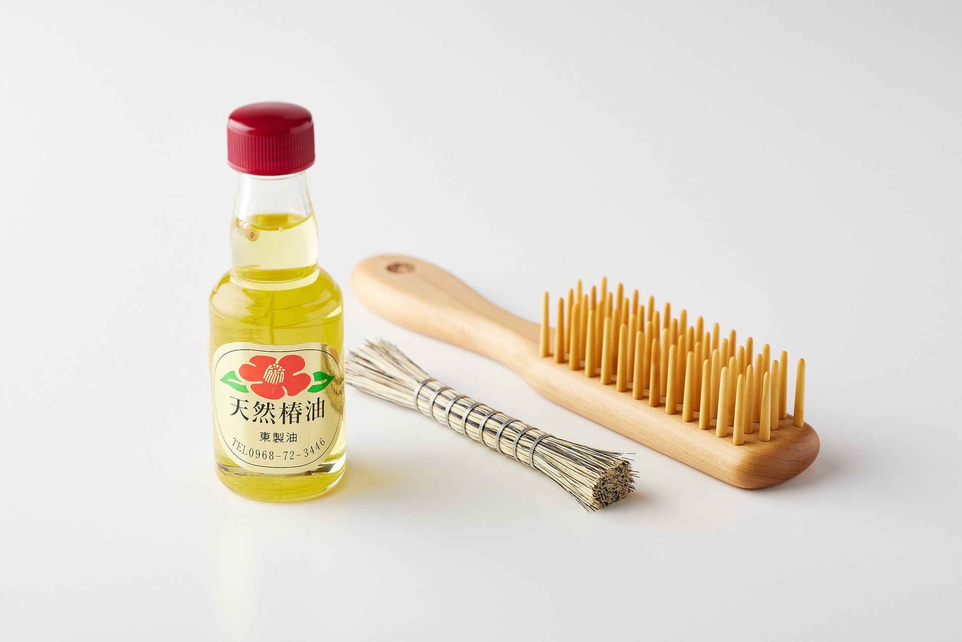 This product is a set that includes a tsuge brush, a dedicated care brush (approx. 11 cm long), and 70 ml of camellia oil.