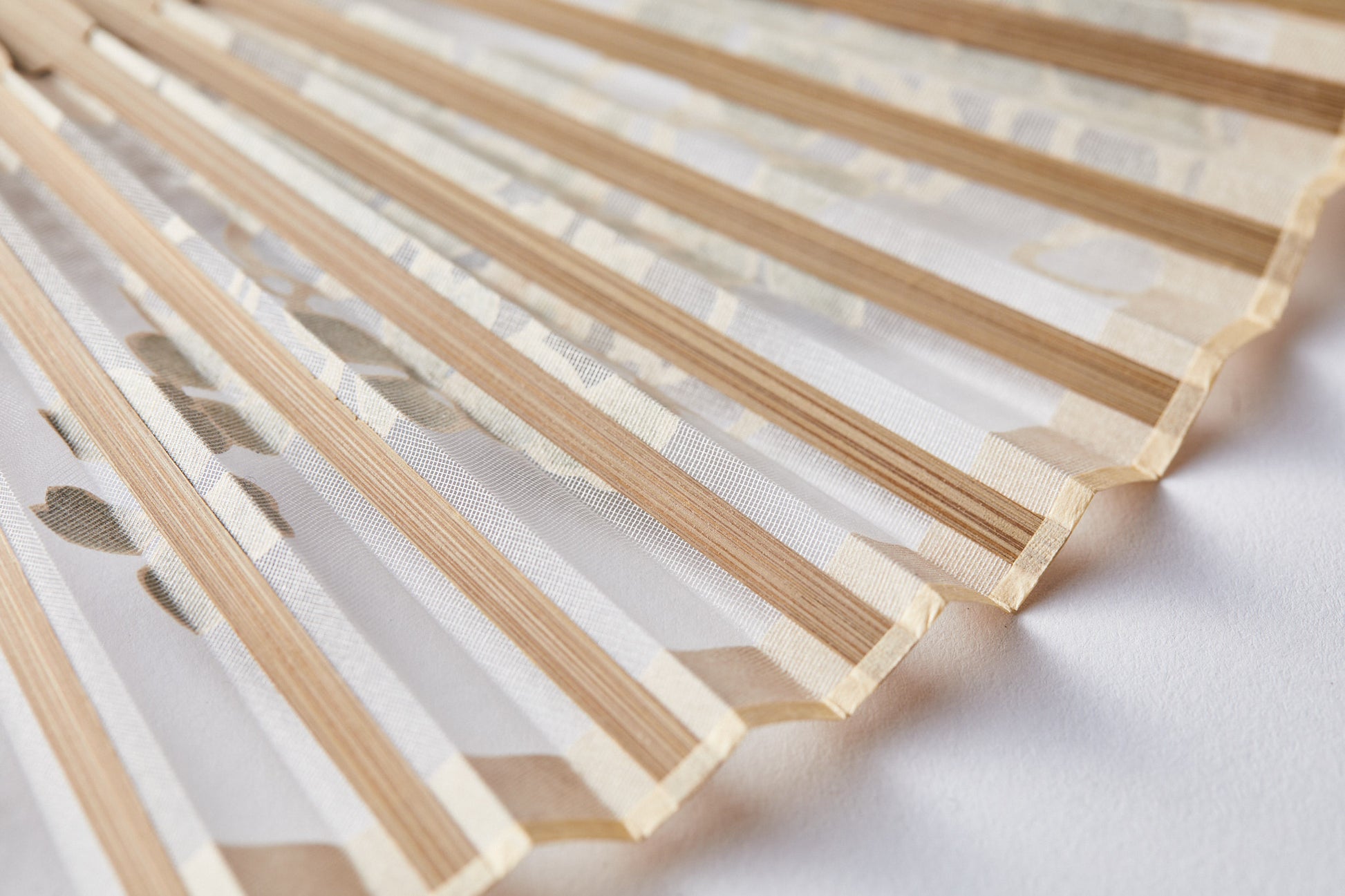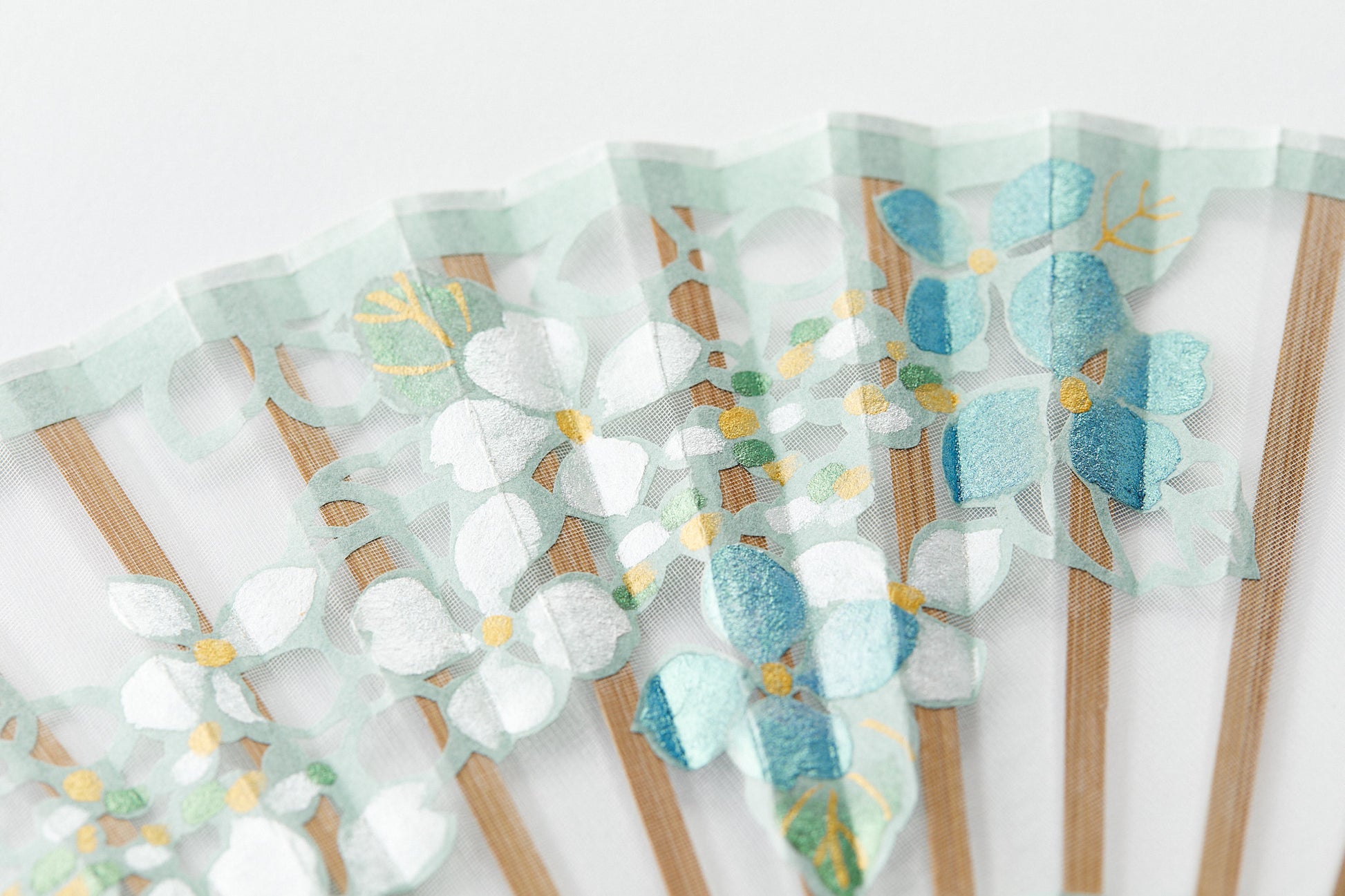 Satsukisen uses a technique called "katabari" (one-sided pasting) to create original folding fans that are not limited by the material, thickness, or shape. This product uses specially thin Ecchu washi paper, which is designated as a national traditional craft. A thin layer of gauze (a type of silk fabric) is pasted on the back of the hand-carved floral pattern, creating a cool, sheer feel.